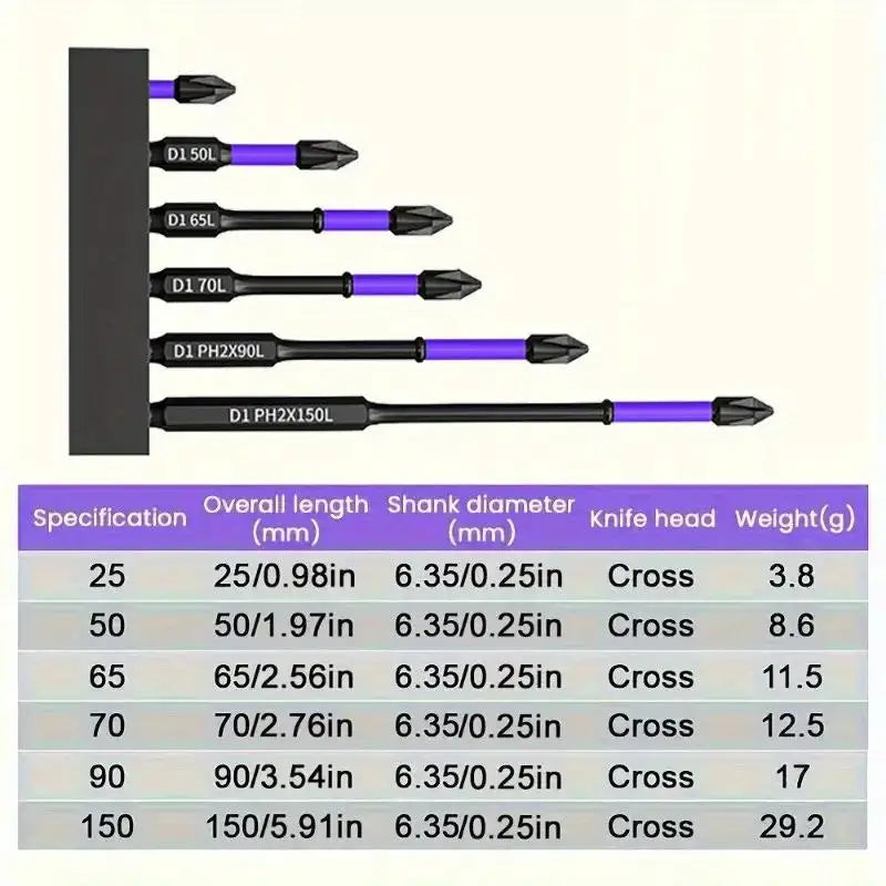- Six magnetic bits designed for Phillips screwdrivers ensure secure retention, quick bit changes, and reliable alignment in challenging angles, even in tight corners.