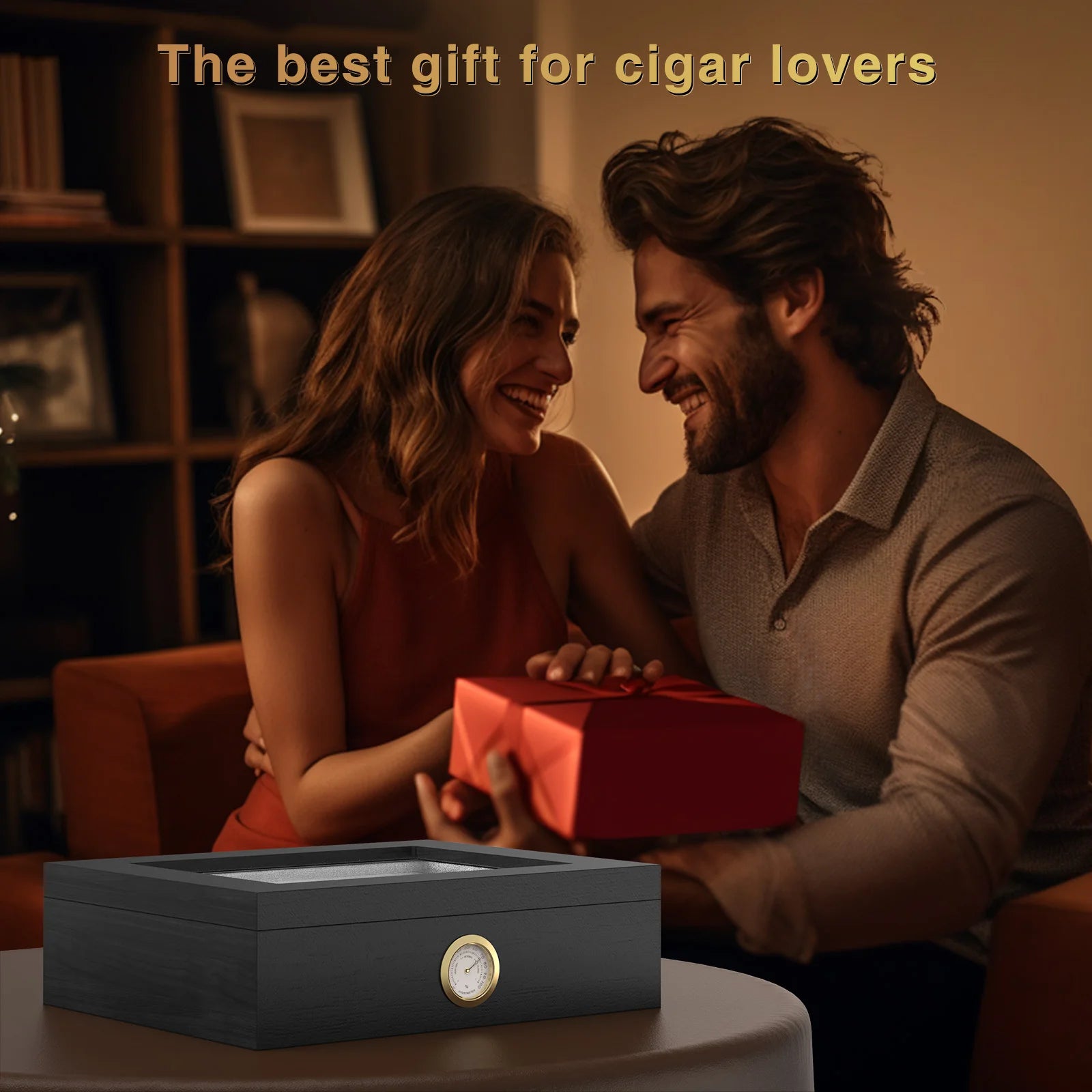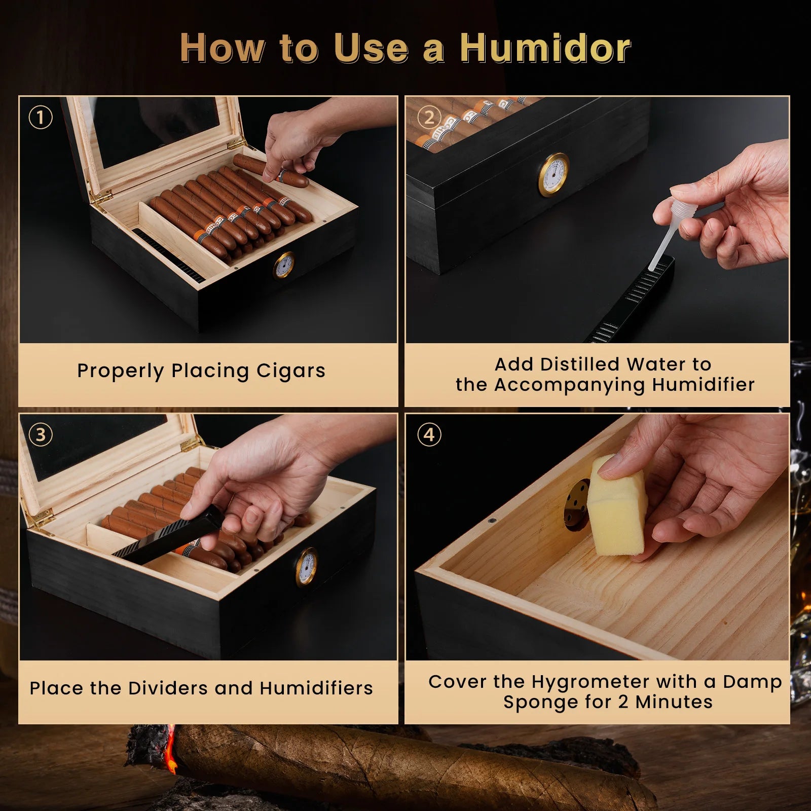 - You can monitor and display your cigars at a glance thanks to the crystal-clear tempered glass top, removable divider for 20–30 cigars, and a complete care bundle including a humidifier and a dropper.