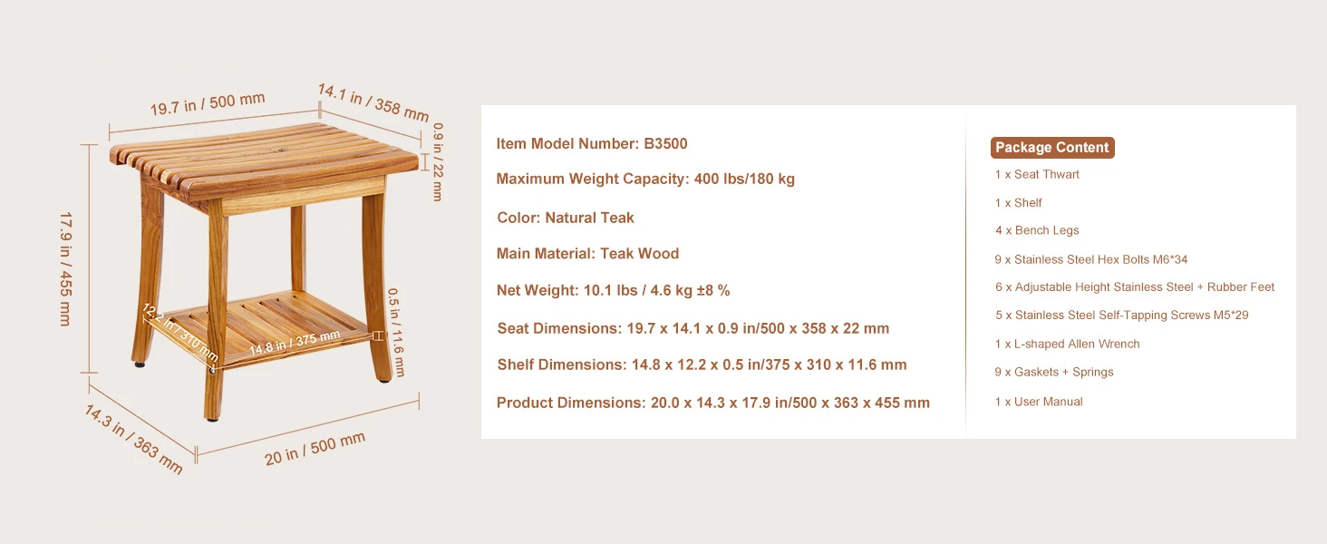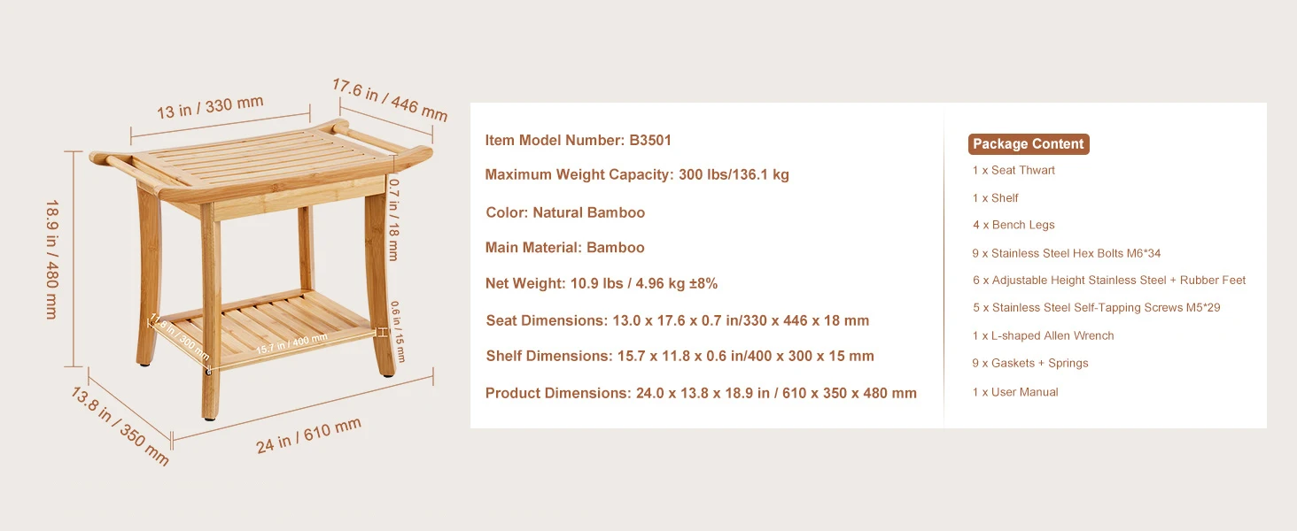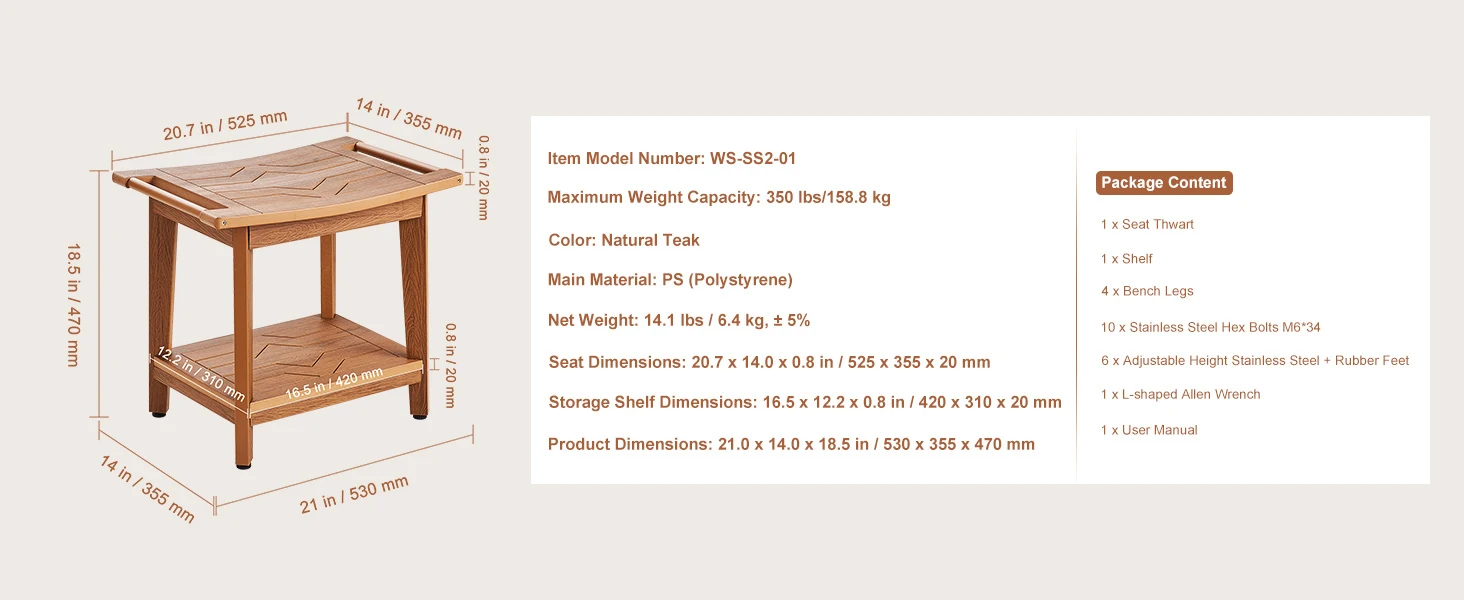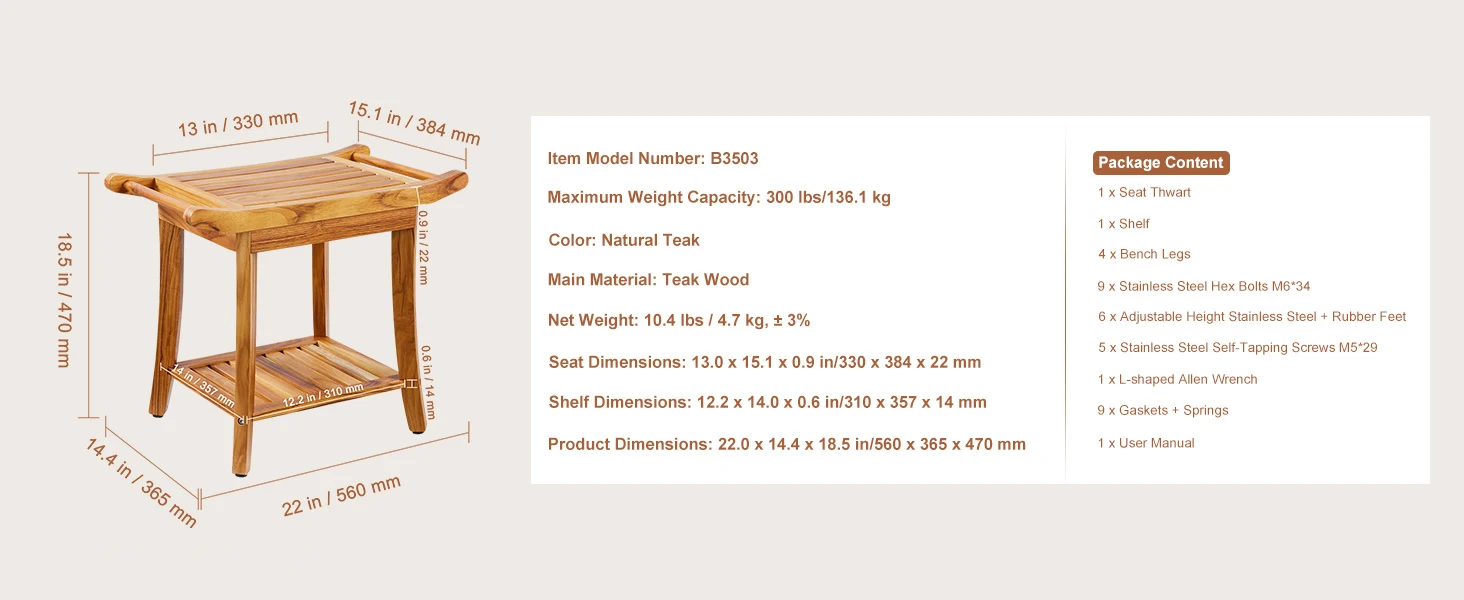 330 lbs Capacity, Multi-layer Reinforcement: Discover our robust shower stool designed to support up to 330 lbs / 149.7 kg, ensuring security whether you're standing or seated. Enjoy ample storage space for multiple toiletries or books with confidence. These benefits are enhanced by multiple reinforcement details: reinforced panels under the seat, wedge-shaped braces on the legs, and externally secured screws for the shelf.