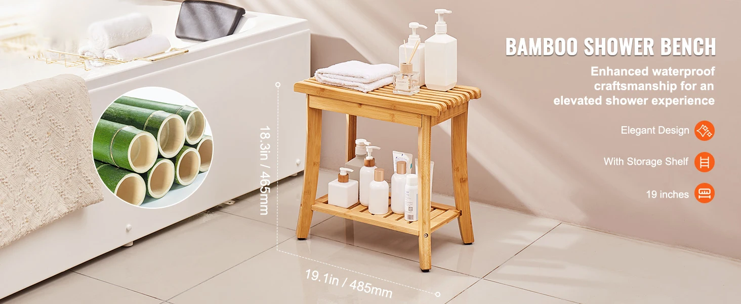 Natural Bamboo, Mold-Resistant Coating: Transform your shower routine with our all-natural bamboo shower bench, treated with a waterproof painting and mold-resistant coating for enhanced durability. Its smart slatted design ensures efficient drainage and quick drying, perfect for humid environments like your shower area. Discover the beauty and functionality of sustainable bamboo in your bathroom today!